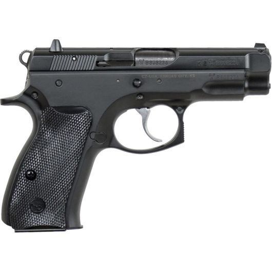 At 5″ tall with a barrel length of just under 4″, the Compact model shaves a little more than 3/4″ off the length and about 1/2″ off the height of the full-size CZ 75. Its reduced size allows it to readily disappear under regular clothing. The CZ 75 DA/SA action with a manual safety lever provides the user with two options for carry: hammer-back with the safety on for single action operation or manually decocked for a double action first shot with no need to remember to take off the safety before firing. Because the 75 Compact retains the steel frame of the original 75, only 2.4 oz of weight is lost, making it the softest-shooting compact in the CZ 75 line.