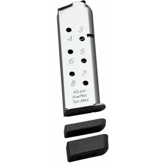 This stainless 45 Auto magazine is designed for Kimber Custom and Pro models.