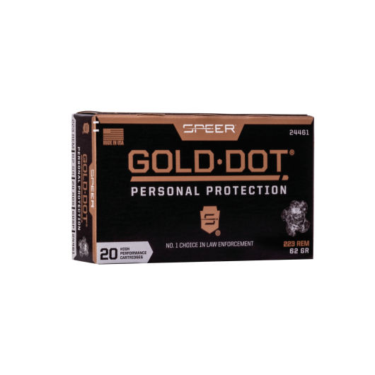 Speer Gold Dot ammunition’s reliability has made it the No. 1 choice for law enforcement, and we offer the same performance for self-defense rifle applications. Gold Dot rifle is engineered to provide industry-leading performance in FBI protocol testing through barrels less than 16 inches long. Its bullets are built using Speer’s exclusive Uni-Cor method. The jacket is bonded to the core one atom at a time, virtually eliminating core-jacket separation and creating a projectile that’s accurate, tough and consistent through all common barriers.