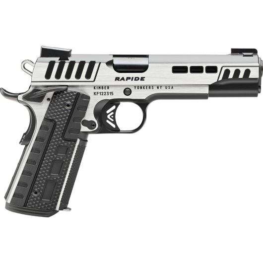 The RAPIDE(SCORPIUS) (DN,NS). A truly unique 1911 with stepped cocking serrations, slide lightening cuts for faster Slide lock-up and DLC coated barrel for extreme durability. Equipped with Kimber Stiplex TM front strap stippling and Black G10 Rapide patterned grips for extra griping confidence. Kimpro Black finish with brush polished flats finish off the striking looks.