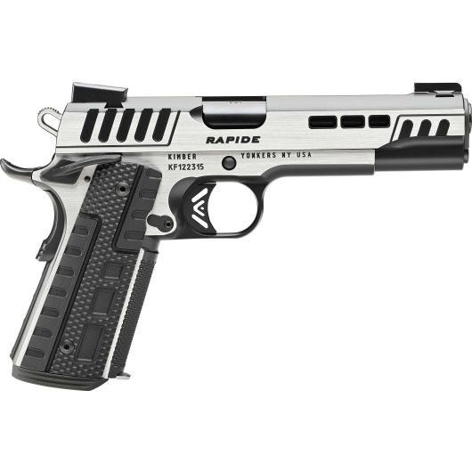 The RAPIDE(SCORPIUS) (DN,NS). A truly unique 1911 with stepped cocking serrations, slide lightening cuts for faster Slide lock-up and DLC coated barrel for extreme durability. Equipped with Kimber Stiplex TM front strap stippling and Black G10 Rapide patterned grips for extra griping confidence. Kimpro Black finish with brush polished flats finish off the striking looks.