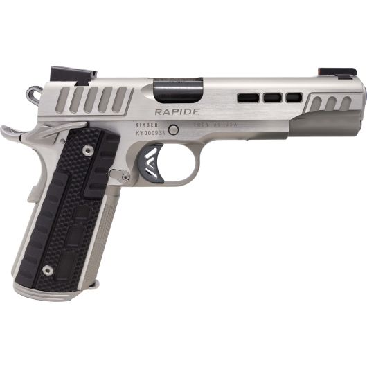 The RAPIDE (Frost) (DN,NS). A truly unique 1911 with stepped cocking serrations, slide lightening cuts for faster Slide lock-up and DLC coated barrel for extreme durability. Equipped with Kimber Stiplex TM front strap stippling and Black G10 Rapide patterned grips for extra griping confidence. Kimpro Silver finish with brush polished flats finish off the stunning looks.