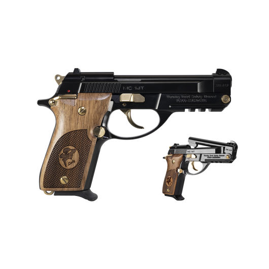 The MC 14T Lady, at first glance, has a set of engraved wood checkered grips, a gloss black finish with a set of gold controls and small parts to bring out the elegance and sophistication. But a true Lady isn’t just all looks. On the barrel are 4 ported holes that make up the Soft Recoil Pistol design, which is a feature that significantly reduces muzzle rise and reduces felt recoil while shooting. This allows for faster follow up shots and overall, more comfort when practicing on the range. In the video below you can see the difference when shooting with our Soft Recoil Pistol design.