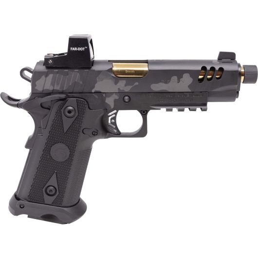Davidson’s Exclusive: Laser Etched Black Camo Cerakote Finish, Lightning Cut Slide, Threaded 1/2×28 Gold Barrel