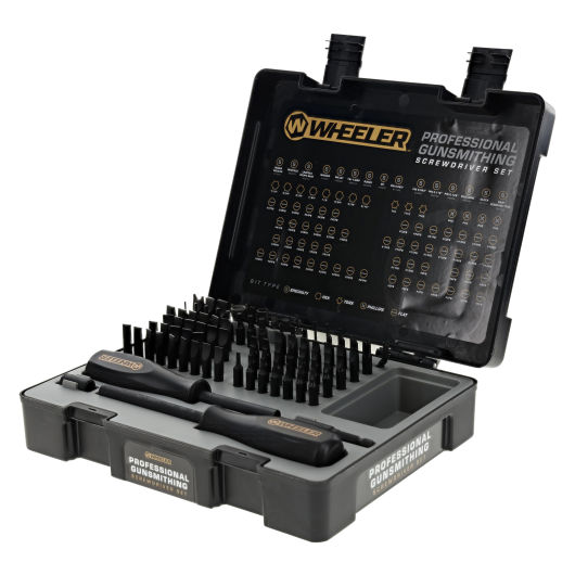 Whether you are a professional or in-home gunsmith, the Wheeler® 89 Piece Professional Gunsmithing Screwdriver Set is a must-have staple in your toolset. Unlike other screwdriver suppliers, Wheeler’s engineers measured the screws on over one hundred modern and antique firearms to ensure that we offered specialty bits for every situation. Whether you are working on a Browning® Superposed, a Remington® 700, a Smith & Wesson® revolver, or a Colt® single action, you will find that there is a bit to fit every screw on your gun. The two included drivers feature magnetized tips and rubber over-molded handles that improve ergonomics and grip while reducing hand strain. The driver shafts and bits all have a black phosphate coating that prevents rust and corrosion and extends tool life; guaranteeing that your tools will look great for years to come. All the contents are neatly organized and secured in a premium latching hard case that easily stacks on top of other Wheeler screwdriver sets for smart, convenient storage.