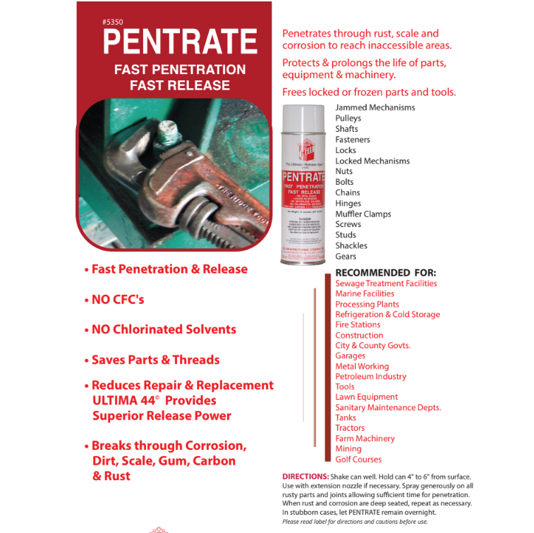 PENTRATE penetrates through rust, scale, and corrosion to reach inaccessible areas. It protects & prolongs the life of parts, equipment & machinery, and frees locked or frozen parts and tools.