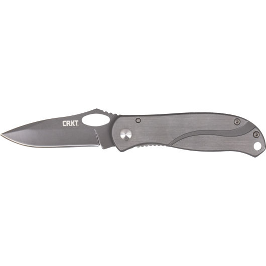 The Pazoda™ is a stylish frame-lock folder with a titanium nitride coated blade. The stainless steel handles are also given a gray titanium nitride coating, and then a brushed finish on the outer surface only, leaving an ample bright area for imprinting or engraving. The oval blade hole allows fast either-hand opening.