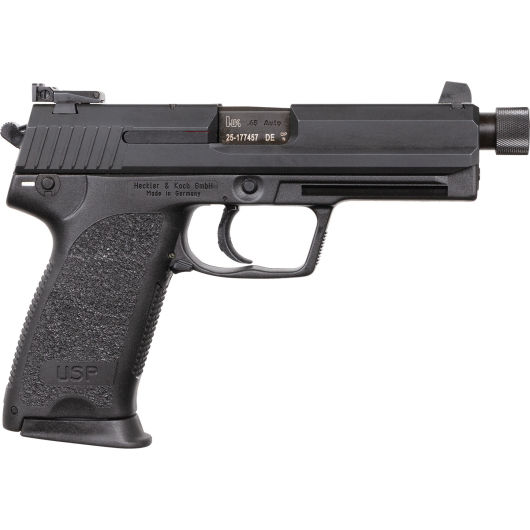 Enhanced versions of the USP, the USP Tactical models are designed for users who need the features found on the HK Mark 23, but in a more compact and lighter weight pistol. USP Tactical pistols approach the precision found on the Mark 23 by adding an extended threaded barrel with a rubber O-ring, adjustable trigger, and adjustable target-type sights. The .45 ACP model of the USP Tactical is constructed on the USP45 frame.