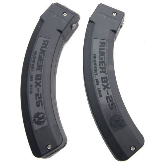 This two-pack of genuine Ruger® factory magazines with Ruger logo has been tested and has proven to feed as reliably as the standard BX-1 10-round Ruger® rotary magazine. BX-25® magazines will work with any factory original 10/22® Rifle, SR-22® Rifle, 22 Charger™ Pistol, .22 LR Ruger American Rimfire® Rifle and .22 LR Ruger 77/22® Rifle.