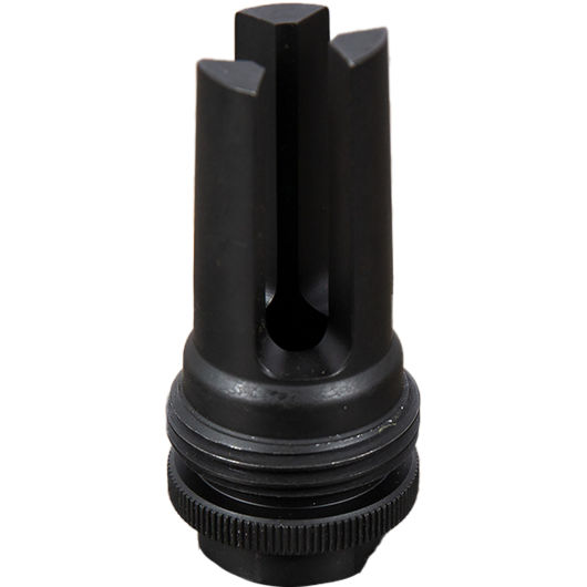 The ASR Flash Hider is compatible with ASR (Active Spring Retention) Mounts. The ASR (Active Spring Retention) Mount is a quick attach / detach system for almost all SilencerCo suppressors. The simple one-hand-on, one-hand-off mounting system is compatible with all ASR Muzzle Devices to promote ease of transfer from one silencer to another. Once shouldered, the locking ring ensures the silencer won’t rotate or work itself loose under a heavy firing schedule. The patent-pending resonance suppression effectively eliminates the tuning-fork effect common with competing 3-prong Flash Hiders.