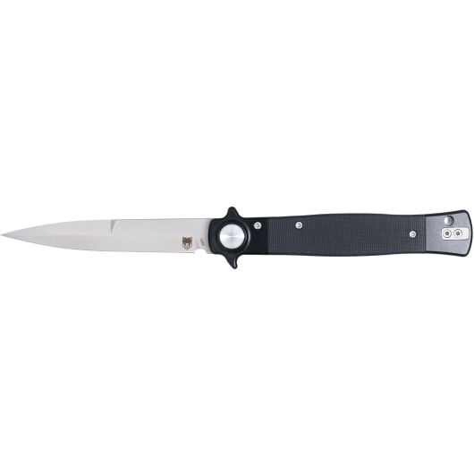 The sleek handle is fitted with textured G-10 scales, delivering a secure and comfortable grip while keeping the knife lightweight and durable. This Stiletto’s button lock action is very smooth with ball bearings in the pivot ensuring lightning-fast, one-handed deployment with the flip of the finger stud. The button lock offers secure and reliable lockup during use and one-handed release for closing.