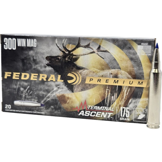 Any hunt. Any range. Go beyond what you ever thought possible with Federal Premium® Terminal Ascent™ Bonded construction penetrates deep on close targets, while the patented Slipstream™ polymer tip initiates expansion at velocities 200 fps lower than comparable designs. The bullet’s long, sleek profile offers an extremely high ballistic coefficient, and its AccuChannel™ groove technology improves accuracy and minimizes drag. Available in a full selection of long-range hunting cartridges.